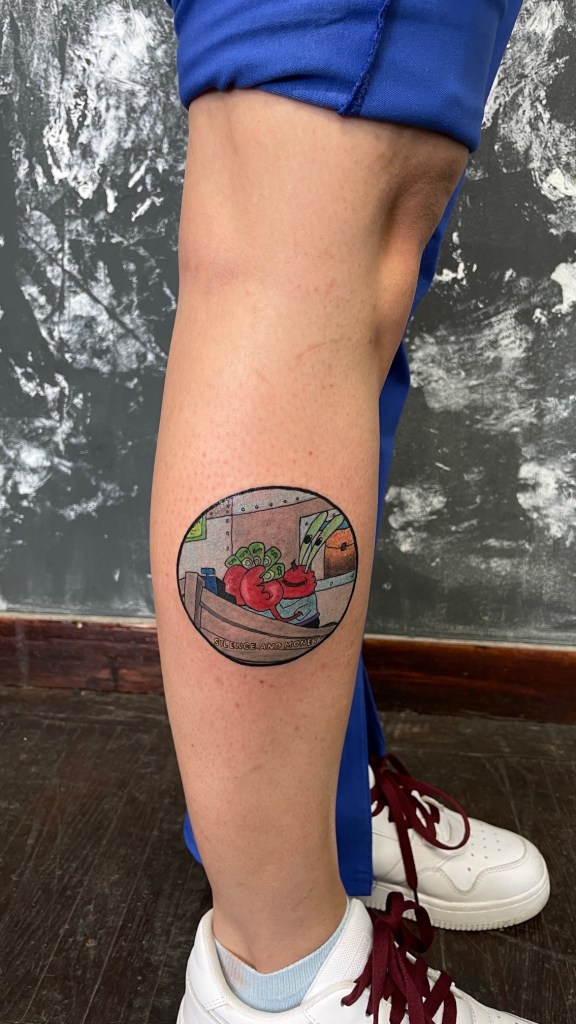 Am decis să mi-l tatuez pe Mr. Krabs din Spongebob deoarece nu îmi ieșea acea imagine din minte. În mai multe situații ajungeam să îi imit expresia facială și să mă gândesc la cele două lucruri pe care eu (și mulți alți capricorni) le adoră: banii și liniștea. Prin urmare, chiar dacă acest desen animat nu a reprezentat prea mult pentru copilăria mea, mi-am dorit să imortalizez cu ironie acest crab cu care rezonez.