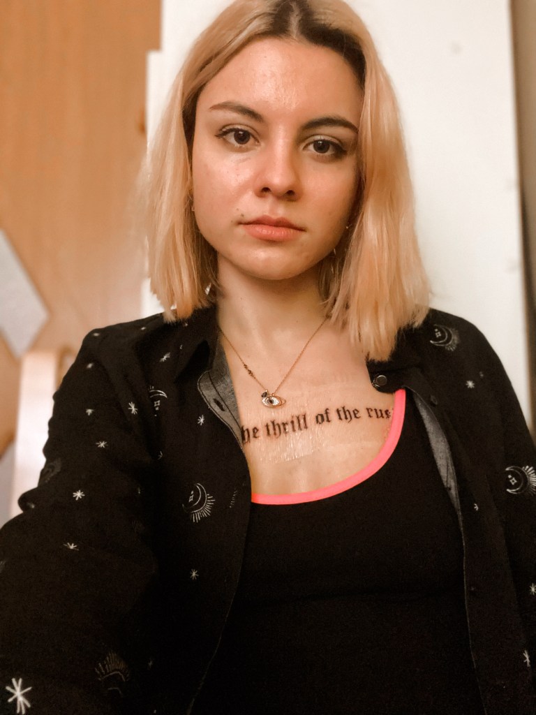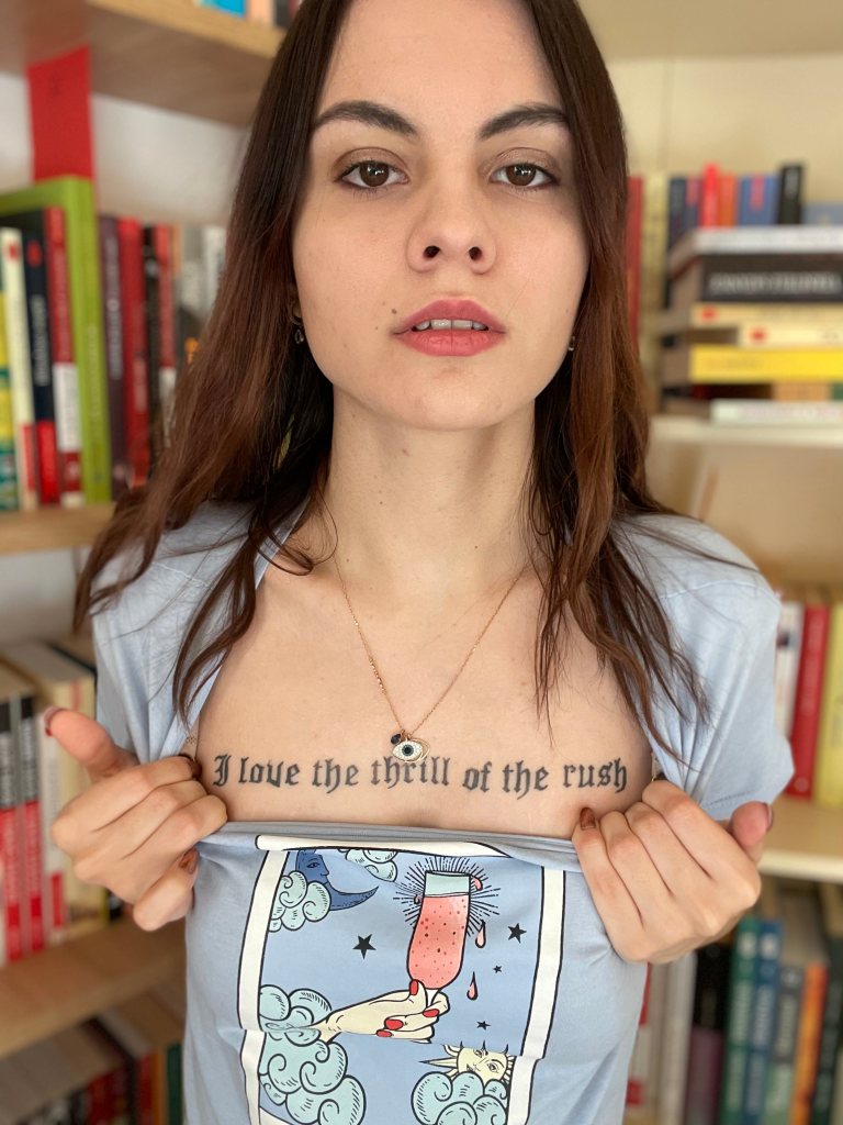 Tatuajul sub formă de text de pe piept atrage cel mai adesea atenția oamenilor, care mă întreabă ce scrie. „I love the thrill of the rush” este un vers din melodia „Serial Killer” a Lanei del Rey, artista mea favorită. Voiam neapărat să îmi tatuez unul din versurile sale, iar acesta mă reprezenta cel mai bine. Rush-ul are un sens psihologic în acest context.