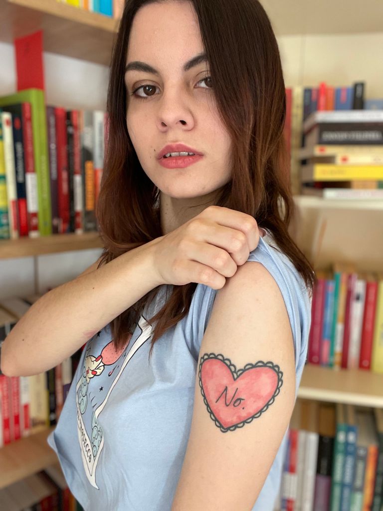 Deși nu pare a avea o semnificație profundă, iar eu am ales doar să îmi urmez instinctul atunci când mi-am tatuat-o, mi-am dat seama ulterior că „No.” vine de la „No is a complete sentence„, afirmație în spatele căreia stau cu tărie. Dintre toate tatuajele mele, acesta s-a păstrat cel mai bine. Mi-am dorit să fie aproximativ la același nivel cu primul, de pe umărul drept și să conțină culori similare de dragul simetriei.