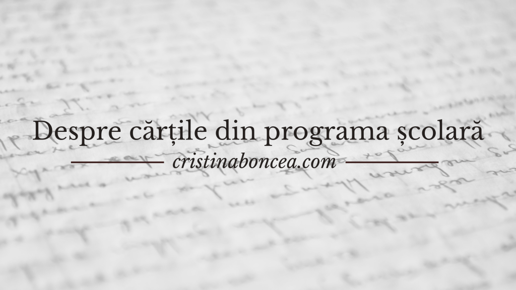 A venit vremea să menționez și motivele pentru care nu am citit la timp recomandările de lecturi școlare sau am trăit un sentiment de repulsie față de programă. Vreau să subliniez că viziunea mea nu are în vedere calitatea lucrărilor în sine; nu contest valoarea lor sau meritele autorilor, ci pur și simplu aspecte care țin de adaptarea la mai multe criterii esențiale. Iată de ce îmi displace programa școlară, din perspectiva unui cititor adult: