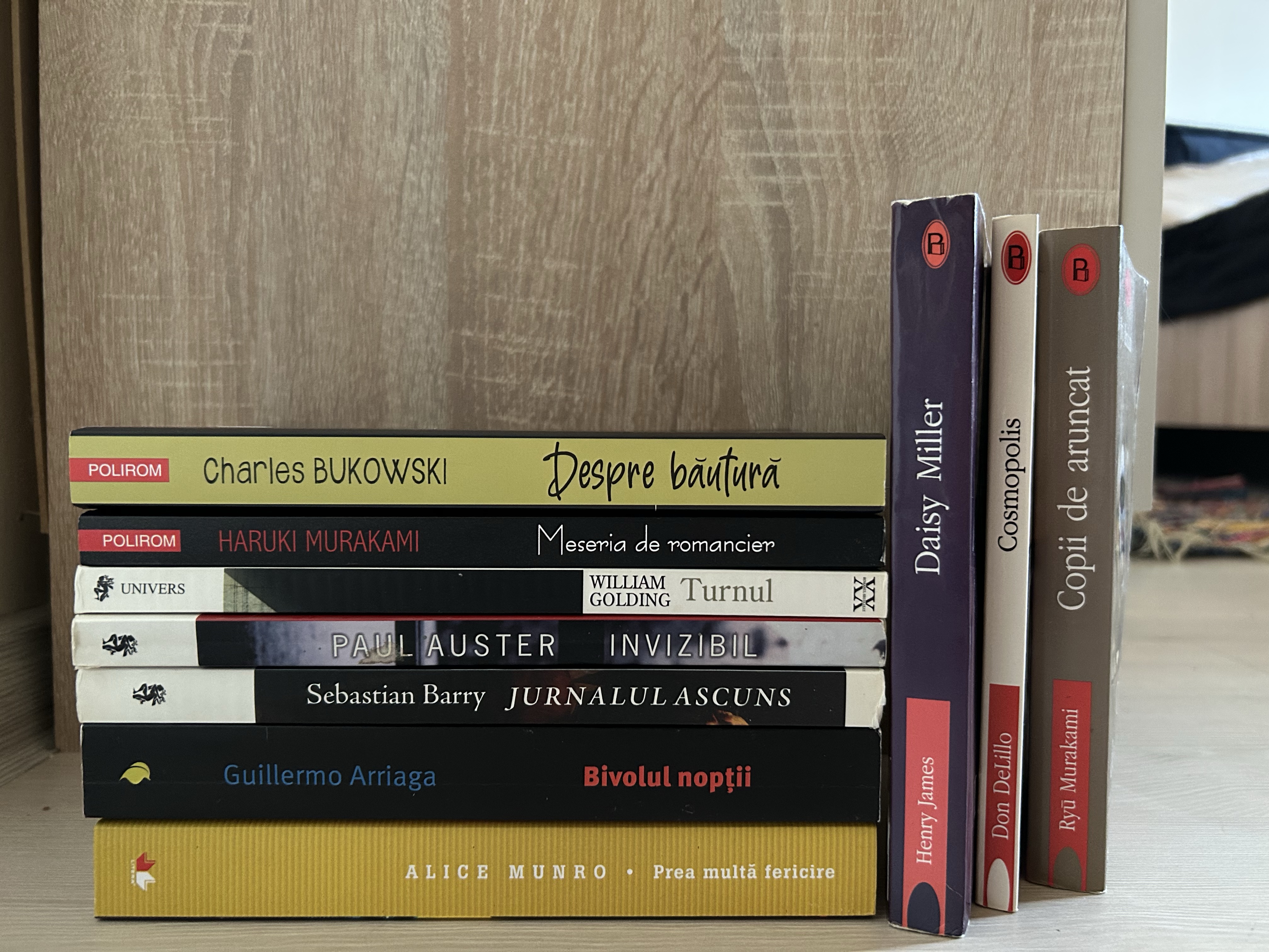 Deși am renunțat la ficțiunea lui Haruki Murakami din motive de exasperare, am decis totuși să achiziționez lucrarea de non-ficțiune Meseria de romancier; îmi place să parcurg „învățămintele” oferite publicului de către autorii de succes, indiferent dacă sunt sau nu fana lucrărilor publicate de ei. Mai avem trei cărți în format mic de care sunt foarte încântată: Daisy Miller, o raritate în acest format după cunoștințele mele, Copiii de aruncat de nou descoperitul și proaspăt admiratul Ryu Murakami și Cosmopolis, cea de-a treia carte pe care aș citit-o de la abstractul și fascinantul Don DeLillo.