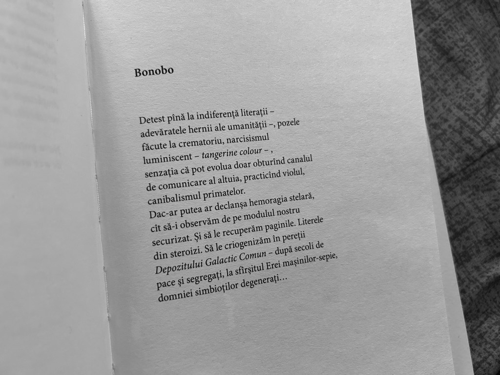 Mi-a plăcut și grupajul de trei poezii sub numele Zmeie pe cer din volumul Bonobo sau cucerirea spațiului. Aici Manasia revine puțin la stilul său inițial, prefigurat în primele două volume. Avem un poem mai lung intitulat simplu Daniela, care ne spune trista poveste a unei doctorițe cu o soartă aproape la fel de crudă ca a câinelui din primul volum. Poezia eponimă a acestei părți este, la fel, o poveste despre moarte care mi-a amintit foarte tare de povestirea lui Truman Capote, O amintire de Crăciun. Csilla este un alt personaj recurent în textele lui Manasia, iar poezia cu acest titlu oferă imagini la fel de puternice: „(…) grădinile iwagumi/pentru sufletul tău comic și duios/ridicol, dar plin de importanță:/erai un tigru siberian, noi arbitram sunetele„.