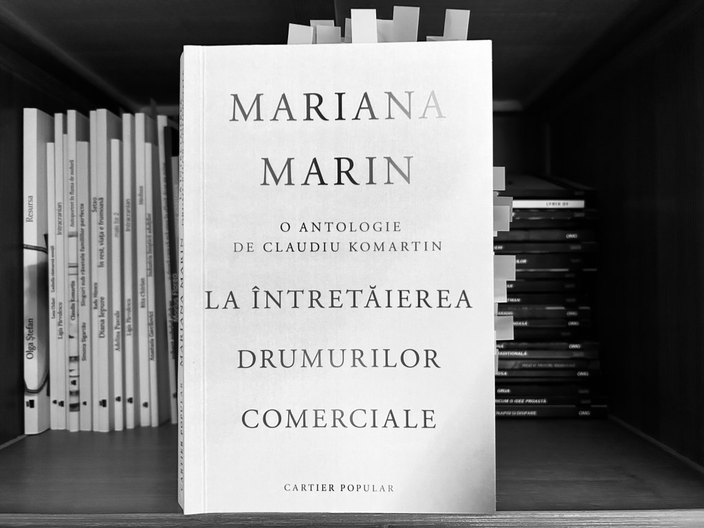 Îmi place foarte mult să citesc antologii de autor; am încredere în cei care selectează textele că îmi vor arăta exact esențialul. La întretăierea drumurilor comerciale conține cinci volume publicate în perioada 1981-2002. Reiese din ele un anumit spirit al vremii, poate influențe baudelariene, poate relicve bacoviene (la Mariana Marin apare destul de des menționat autorul), dar totul cu un twist al modernismului despre care vorbea Gheorghe Crăciun: aducerea autorului în prim-plan, tranzitivitatea.